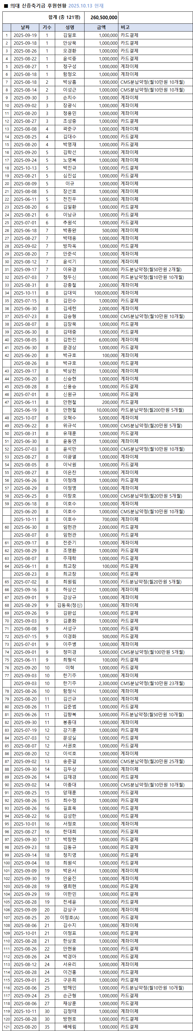 금일 현재 총 121명이 2억 6,050 만원을 의대 신증축 기금으로 모금해 주셨습니다.